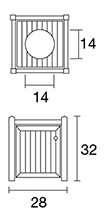 Receptacle measures 28 in. square by 32 in. high. Lid hole measures 14 in. in diameter.